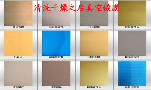 彩色不銹鋼是在不銹鋼板上進行技術性和藝術性加工,使其表面成為具有各種絢麗色彩的彩色不銹鋼裝飾板,其顏色有淺金黃色,金黃色,寶石藍,**色,咖啡色,幼彩色,鋯金色,青銅色,玫瑰色,香檳色等,所以拉絲不銹鋼板清洗干燥之后進行真空膜鍍色。