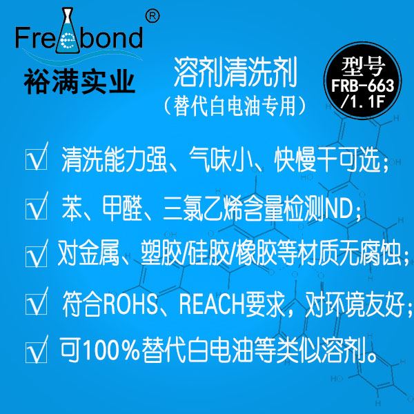 快干溶劑清洗劑|快揮發(fā)溶劑清洗劑|裕滿清洗劑FRB-663/FRB-1.1F是一種用于替代白電油等正己烷類溶劑的環(huán)保清洗劑;本品不僅具有正己烷類溶劑良好的清洗力,還可降低職工正己烷等化學(xué)品急性和慢性中毒危害。