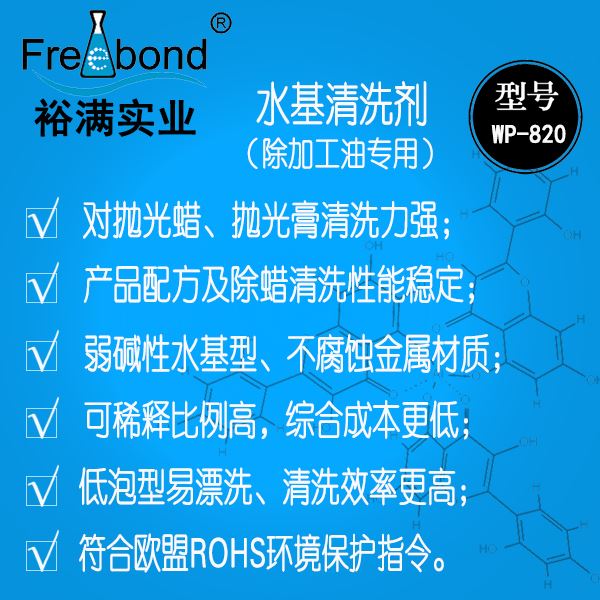 水基除蠟水|水基除臘水|水基性蠟劑|水性除臘劑|裕滿清洗劑WP-820是一款以表面活性劑為主要成分的除蠟清洗劑,適用于各類金屬工件的表面拋光蠟和拋光膏的清洗;本品具有除蠟清洗力強、性能穩(wěn)定、低泡型易漂洗、綜合成本低、不腐蝕材質(zhì)且能保持拋光面原有的光澤等優(yōu)點。