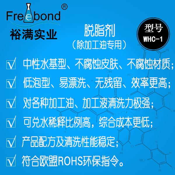 中性脫脂劑|中性除油劑|中性清洗劑|裕滿清洗劑WHC-1是一款以表面活性劑為主要成份的水基清洗劑;本品能夠徹底的清除工件表面的各種加工油、加工液等臟污,具有清洗力強(qiáng)、性能穩(wěn)定、低泡型易漂洗、綜合成本低、不腐蝕材質(zhì)等優(yōu)點(diǎn)。