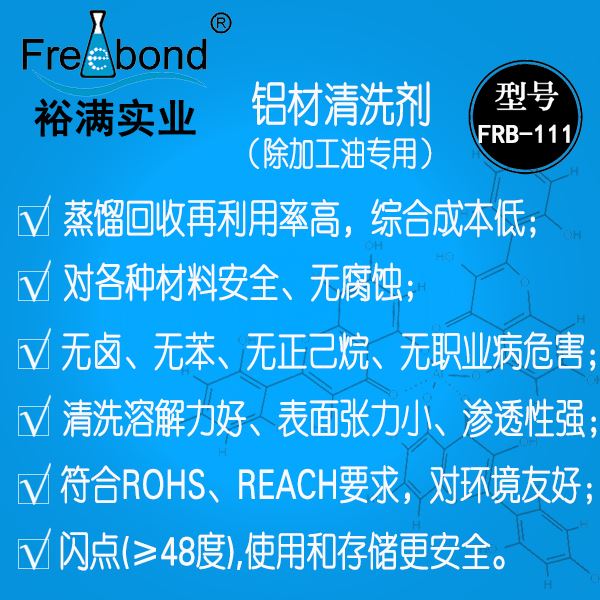 碳?xì)滗X材清洗劑|碳?xì)滗X材脫脂劑|碳?xì)滗X材除油劑|裕滿清洗劑 FRB-111是用于清洗金屬生產(chǎn)加工制造過程中表面殘留加工油、塵埃等各類污物的無毒環(huán)保清洗劑,本品具有清洗力強(qiáng)、清洗性能穩(wěn)定、對材質(zhì)無腐蝕、環(huán)保安全、無毒無害、綜合成本低等優(yōu)點。