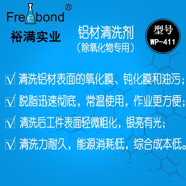 鋁材光亮清洗劑|鋁合金光亮清洗劑|裕滿清洗劑WP-411是一款以表面活性劑為主要成份,用于鋁材(純鋁、鋁合金)表面清洗氧化膜、鈍化膜、油污的清洗劑;本品適合于鋁合金堿蝕處理,氧化膜處理及涂裝前處理等工藝使用。