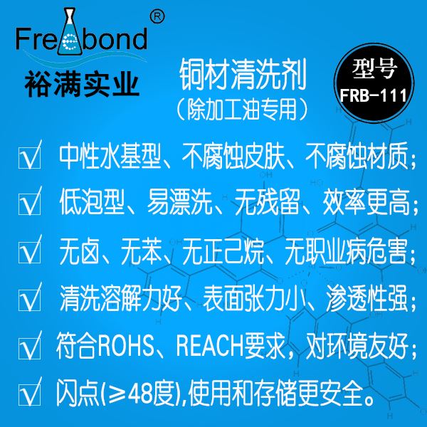 碳氫銅材清洗劑|碳氫銅材脫脂劑|碳氫銅材除油劑|裕滿清洗劑 FRB-111是用于清洗金屬生產(chǎn)加工制造過程中表面殘留加工油、塵埃等各類污物的無毒環(huán)保清洗劑,本品具有清洗力強、清洗性能穩(wěn)定、對材質(zhì)無腐蝕、環(huán)保安全、無毒無害、綜合成本低等優(yōu)點。