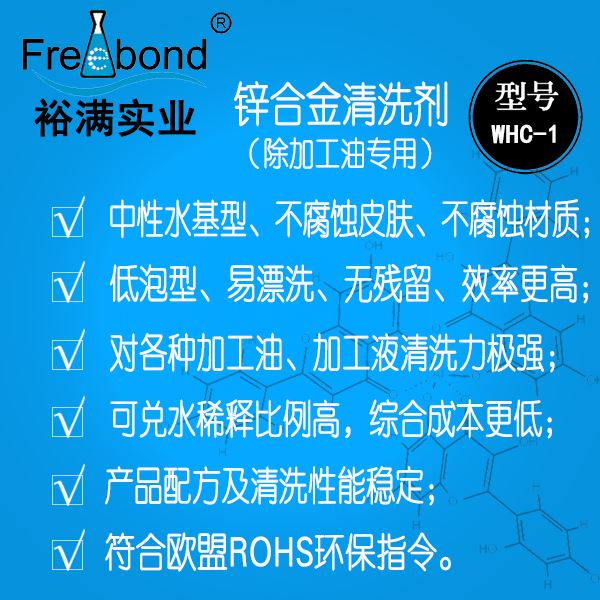中性鋅合金清洗劑|中性鋅合金脫脂除油劑|裕滿清洗劑WHC-1是一款以表面活性劑為主要成份的水基清洗劑;本品能夠徹底的清除工件表面的各種加工油、加工液等臟污,具有清洗力強、性能穩(wěn)定、低泡型易漂洗、綜合成本低、不腐蝕材質(zhì)等優(yōu)點。