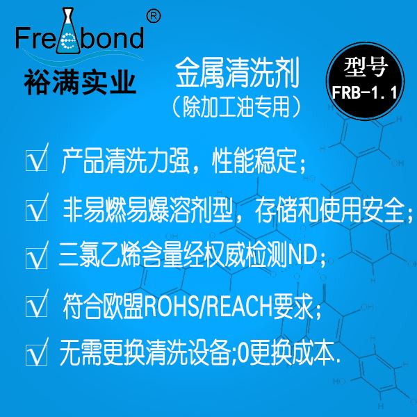 溶劑金屬清洗劑|溶劑金屬脫脂劑|溶劑金屬除油劑|裕滿清洗劑FRB-1.1 是一款替代三氯乙烯、三氯乙烷用于清洗金屬生產(chǎn)加工制造過(guò)程中表面殘留加工油、加工液、蠟脂的環(huán)保清洗劑,本系列產(chǎn)品具有清洗力強(qiáng)、清洗性能穩(wěn)定、對(duì)材質(zhì)無(wú)腐蝕、環(huán)保安全、綜合成本低等優(yōu)點(diǎn)。